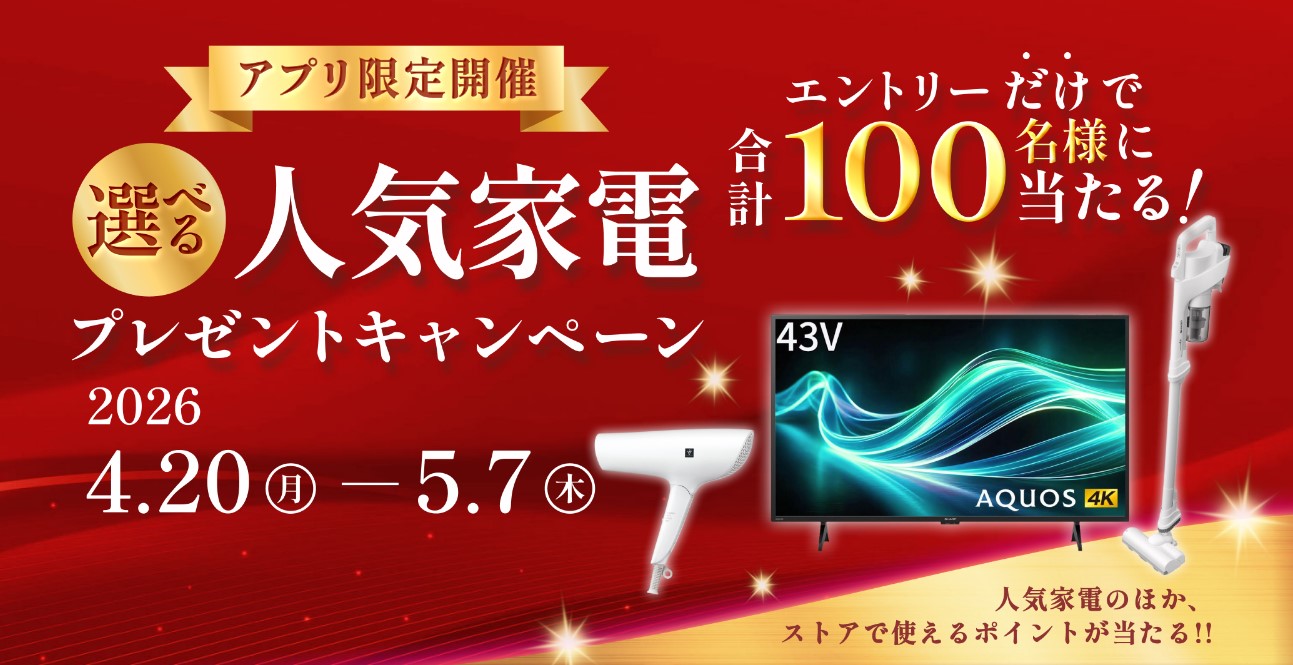【アプリ】人気家電、ストアで使えるポイントを合計100名様にプレゼント 2026.04.26シャープ COCORO STORE‐アプリDLキャンペーン 賞品:人気家電、ストアで使えるポイント(合計100名様) 締切:2026年5月7日(木)エントリーされた会員様の中から、 抽選で100名様に人気家電などが当たる!※詳細はキャンペーンページにてご確認ください。応募はこちらから