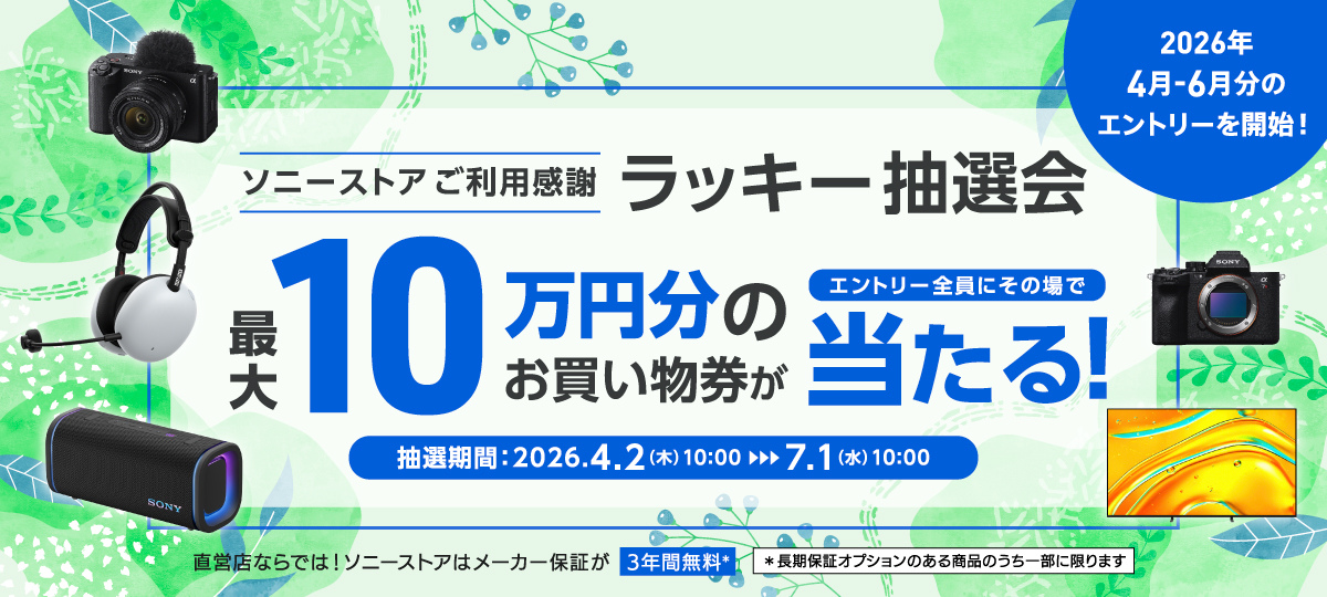 ソニーストアで使えるお買い物券最大10万円分がその場で当たる! 2026.04.26ソニーストアご利用感謝 ラッキー抽選会 賞品:最大10万円分のお買い物券 締切:2026年7月1日(水)10:00ご応募には会員登録/ログインが必要です。※詳細はキャンペーンページにてご確認ください。応募はこちらから