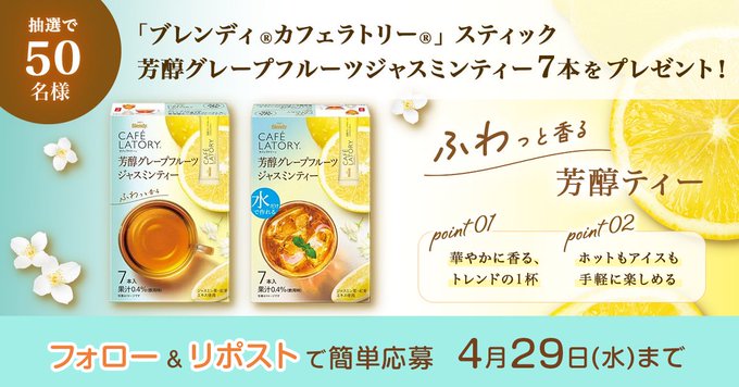 賞品:「ブレンディ®カフェラトリー®」スティック 芳醇グレープフルーツジャスミンティー7本(50名様)