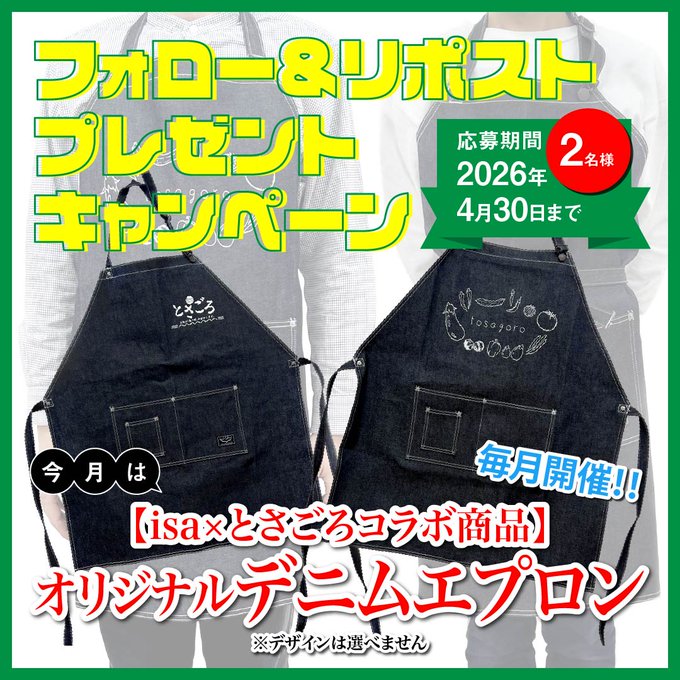 【X懸賞】オリジナルエプロンを2名様にプレゼント 2026.04.28 2026.04.27とさごろ‐フォロー&リポストキャンペーン 賞品:オリジナルエプロン(2名様) 締切:2026年4月30日(木)公式X(Twitter)アカウントをフォロー&キャンペーン対象ポストをリポストしてご応募ください。※詳細はキャンペーンページにてご確認ください。応募はこちらから
