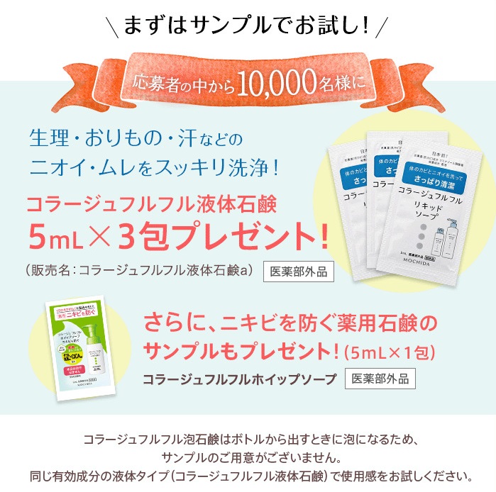 コラージュフルフル液体石鹸 5mL×3回分を10,000名様にプレゼント 2026.04.28持田ヘルスケアのオンラインショップ‐サンプルプレゼントキャンペーン 賞品:コラージュフルフル液体石鹸 5mL×3回分(10,000名様) 締切:2026年5月31日(日)アンケートに答えてご応募ください。※詳細はキャンペーンページにてご確認ください。応募はこちらから