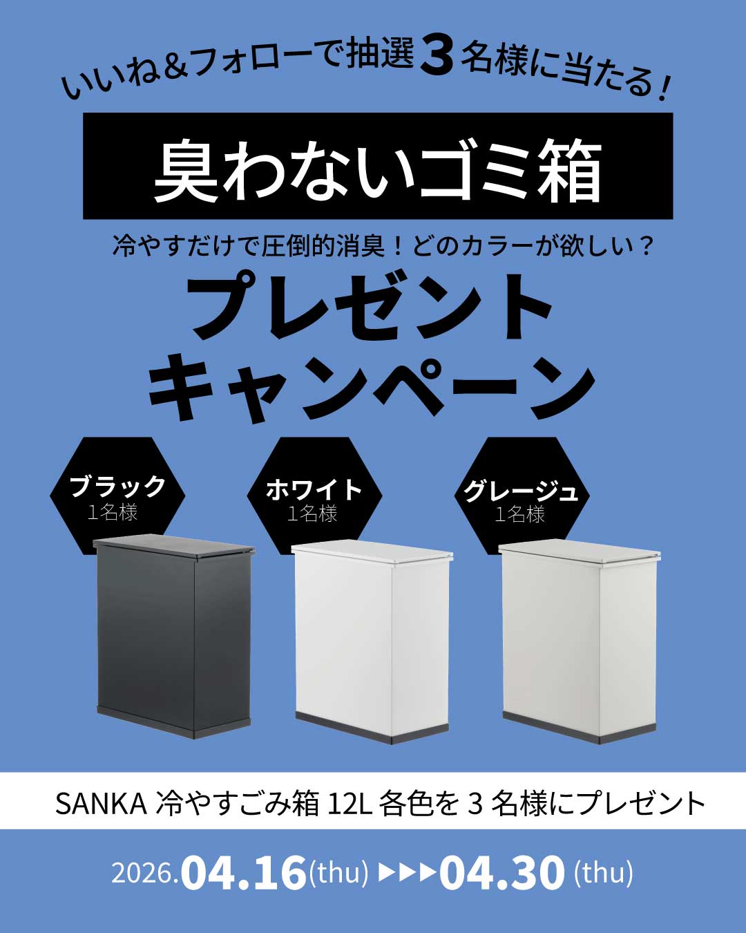 【Instagram懸賞】冷やすごみ箱12Lを3名様にプレゼント 2026.04.28SANKA‐フォロー&いいねキャンペーン/h2> 賞品:冷やすごみ箱12L(3名様) 締切:2026年4月30日(木)応募方法: 1. 公式Instagramアカウントをフォロー 2. 対象の投稿に「いいね!」※詳細はキャンペーンページにてご確認ください。応募はこちらから