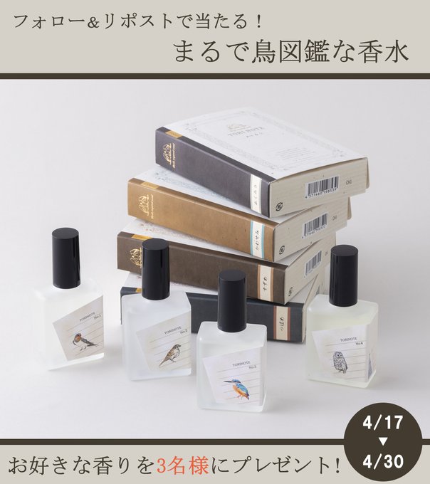 【X懸賞】鳥ノートの香水を3名様にプレゼント 2026.04.29コトノカ‐フォロー&リポストキャンペーン 賞品:鳥ノートの香水(3名様) 締切:2026年4月30日(木)公式X(Twitter)アカウントをフォロー&キャンペーン対象ポストをリポストしてご応募ください。※詳細はキャンペーンページにてご確認ください。応募はこちらから