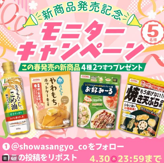【X懸賞】昭和産業新商品セットを5名様にプレゼント 2026.04.29昭和産業‐新商品発売記念 #モニターキャンペーン 賞品:昭和産業新商品セット(5名様) 締切:2026年4月30日(木)公式X(Twitter)アカウントをフォロー&キャンペーン対象ポストをリポストしてご応募ください。※詳細はキャンペーンページにてご確認ください。応募はこちらから