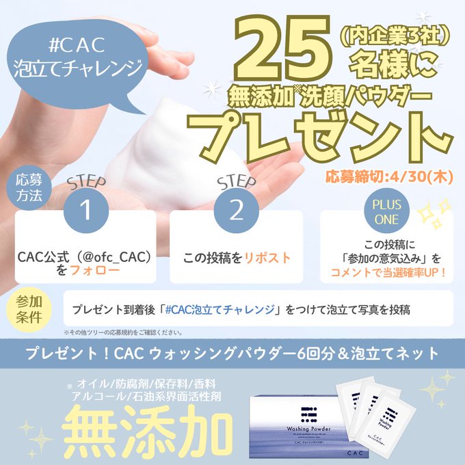 賞品:CACウォッシングパウダー(洗顔6回分)+泡立てネット(25名様)