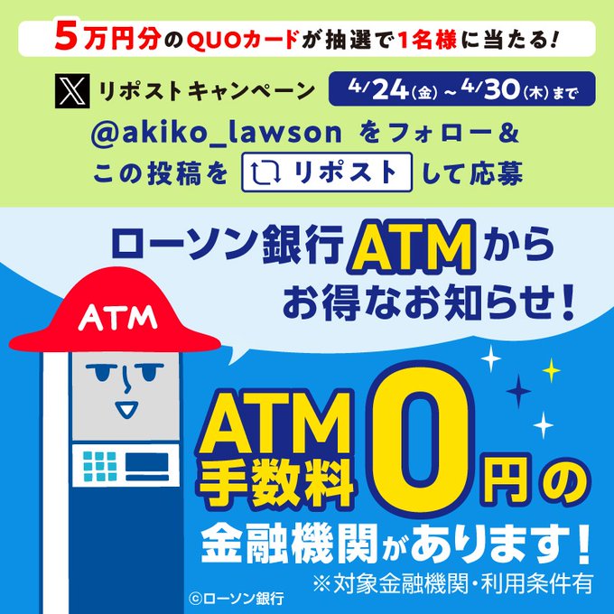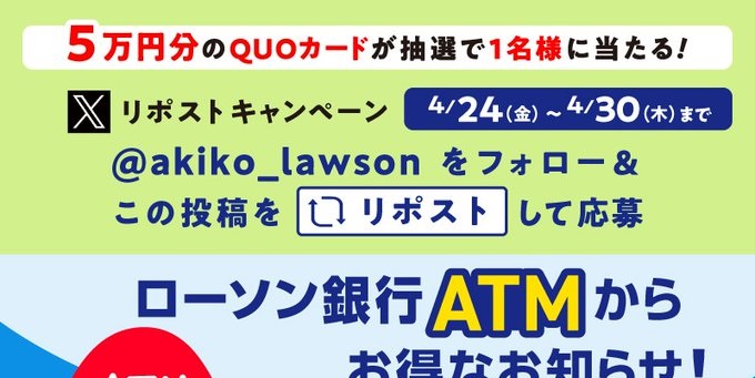 【X懸賞】QUOカード5万円分を1名様にプレゼント 2026.04.29ローソン‐フォロー&リポストキャンペーン 賞品:QUOカード5万円分(1名様) 締切:2026年4月30日(木)公式X(Twitter)アカウントをフォロー&キャンペーン対象ポストをリポストしてご応募ください。※詳細はキャンペーンページにてご確認ください。応募はこちらから