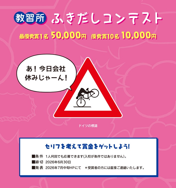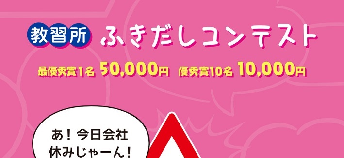賞金50,000円、賞金10,000円を合計11名様にプレゼント 2026.04.29コヤマドライビングスクール‐教習所ふきだしコンテスト 賞品: 最優秀賞:賞金50,000円(1名様) 優秀賞:賞金10,000円(10名様) 締切:2026年6月30日(火)セリフを考えて賞金をゲットしよう!※詳細はキャンペーンページにてご確認ください。応募はこちらから