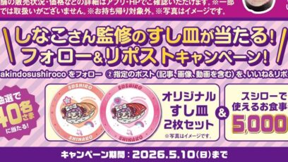 スシロー‐プレゼントキャンペーン 賞品:オリジナルすし皿2枚セット&お食事券5,000円分(40名様) 締切:2026年5月10日(日) 1⃣ @aki...