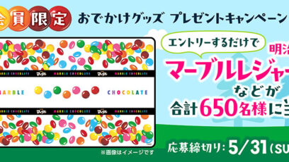 明治‐おでかけグッズプレゼントキャンペーン 賞品: レジャーシート(150名様) マーブル10個(200名様) 明治ポイント200pt(300名様) 締切:2026...