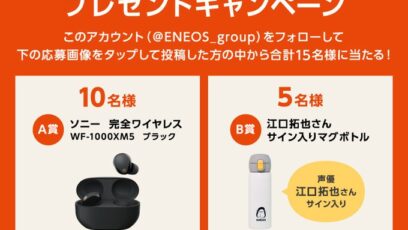 SNS応募の懸賞【X懸賞】ワイヤレスイヤホン、サイン入りマグボトルを合計15名様にプレゼント 締切:2025-10-25 ENEOSこえ報部からのプレゼントキャンペーン 賞品:ワイヤレスイヤホン、サイン入りマグボトル(合計15名様) 締切:2025年10月25日(土) ① @ENEOS_...SNS応募の懸賞
