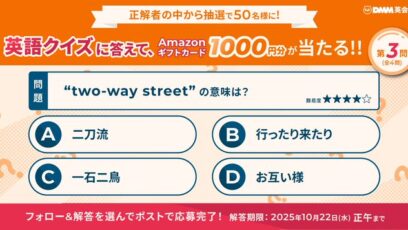 SNS応募の懸賞【X懸賞】Amazonギフト券1,000円分を50名様にプレゼント 締切:2025-10-25 DMM英会話‐プレゼントキャンペーン 賞品:Amazonギフト券1,000円分(50名様) 締切:2025年10月25日(土)12:00 英語クイズに答えて 【アマ...SNS応募の懸賞ギフト券・商品券が当たる懸賞