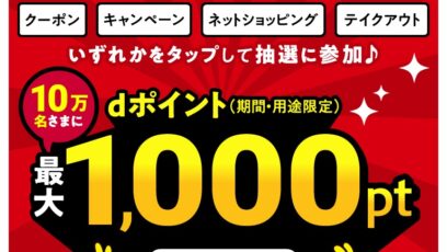 ネット応募の懸賞【アプリ】dポイント最大1,000ポイントを合計100,000名様にプレゼント 締切:2025-11-30 d払いアプリにおトクタブ誕生!ワンタップで最大1,000ポイントプレゼントキャンペーン 賞品:dポイント最大1,000ポイント(合計100,000名様) 締切:2025年1...ネット応募の懸賞大量当選(1000名~)の懸賞ギフト券・商品券が当たる懸賞