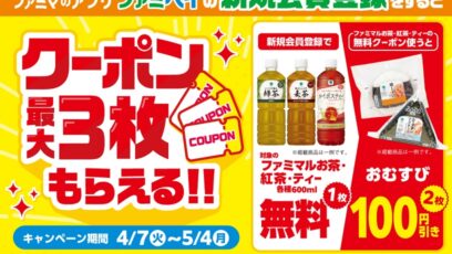 ファミペイ新規会員登録すると、最大3枚クーポンもらえる! 賞品: ファミマルお茶600ml各種無料クーポン(もれなく全員) おむすび各種100円引きクーポン 締切:20...