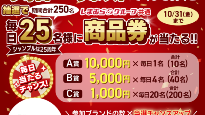 SNS応募の懸賞【毎日・X懸賞】しまむらグループ共通商品券最大10,000円分が合計250名様にその場で当たる! 締切:2025-10-31 シャンブル‐しまむらグループ大創業祭キャンペーン 賞品: しまむらグループ共通商品券10,000円分(合計10名様) しまむらグループ共通商品券5,000円分(合計40名様...SNS応募の懸賞大量当選(100名~)の懸賞ギフト券・商品券が当たる懸賞毎日応募できる懸賞