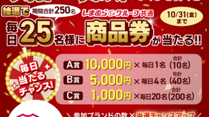 SNS応募の懸賞【毎日・X懸賞】しまむらグループ共通商品券最大10,000円分が合計250名様にその場で当たる! 締切:2025-10-31 しまむらパーク‐しまむらグループ大創業祭キャンペーン 賞品: しまむらグループ共通商品券10,000円分(合計10名様) しまむらグループ共通商品券5,000円分(合計40...SNS応募の懸賞大量当選(100名~)の懸賞ギフト券・商品券が当たる懸賞毎日応募できる懸賞