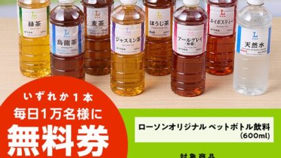 SNS応募の懸賞【毎日・X懸賞】「ローソンオリジナルペットボトル飲料 600ml」無料券が毎日1万名様にその場で当たる! 締切:2025-10-26 ローソン‐フォロー&リポストキャンペーン 賞品:「ローソンオリジナルペットボトル飲料 600ml」無料券(50,000名様) 締切:2025年10月26日(日) ロー...SNS応募の懸賞大量当選(1000名~)の懸賞毎日応募できる懸賞