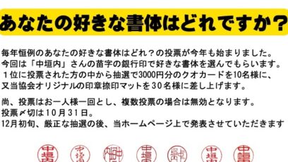 ネット応募の懸賞クオカード3,000円分、オリジナル印章捺印マットを合計40名様にプレゼント 締切:2025-10-31 あなたの好きな書体はどれですか? 賞品: クオカード3,000円分…10名様 オリジナル印章捺印マット…30名様 締切:2025年10月31日(金) 1位に投票さ...ネット応募の懸賞ギフト券・商品券が当たる懸賞