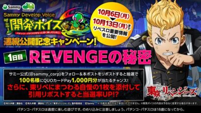 SNS応募の懸賞【毎日・X懸賞】QUOカードPay1,000円分を100名様にプレゼント 締切:2025-10-13 サミー株式会社‐「スマスロ 東京リベンジャーズ」開発ボイス連続公開記念キャンペーン 賞品:QUOカードPay 1,000円分(100名様) 締切:2025年10月13日(月...SNS応募の懸賞大量当選(100名~)の懸賞ギフト券・商品券が当たる懸賞毎日応募できる懸賞