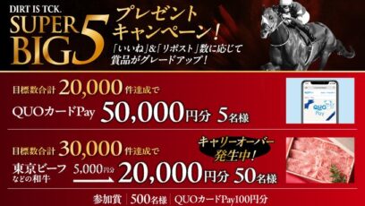 SNS応募の懸賞【X懸賞】QUOカードPay最大50,000円分、東京ビーフなどの和牛20,000円分を合計555名様にプレゼント 締切:2025-10-08 東京シティ競馬 (TCK)‐#TCKSUPERBIG5レースキャンペーン 賞品: QUOカードPay 50,000円分 5名様 東京ビーフなどの和牛 20,000円分 50...SNS応募の懸賞大量当選(100名~)の懸賞豪華賞品が当たる懸賞ギフト券・商品券が当たる懸賞