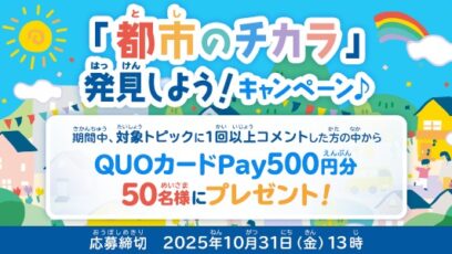 ネット応募の懸賞オリジナルQUOカードPay500円分を50名様にプレゼント 締切:2025-10-31 街育(まちいく)ひろば‐「都市のチカラ」発見しよう!キャンペーン 賞品:オリジナルQUOカードPay500円分(50名様) 締切:2025年10月31日(金)13時 ...ネット応募の懸賞ギフト券・商品券が当たる懸賞
