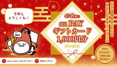 au(音楽好き)からのおとしだま 賞品:au PAY ギフトカード1,000円分(45名様) 締切:2026年1月9日(金) 公式X(Twitter)アカウントをフォ...