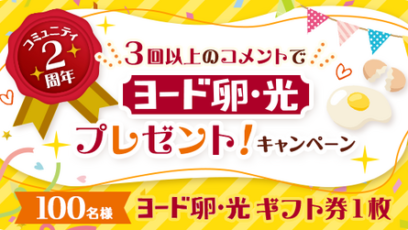 たまご大好き!コミュニティ‐たまご大好きコミュニティ2周年! ヨード卵・光プレゼントキャンペーン 賞品:ヨード卵・光 ギフト券(100名様) 締切:2026年1月27日(火...