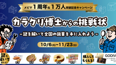 ネット応募の懸賞全国の銘菓を合計150名様にプレゼント 締切:2025-11-23 メビーマーケットプレイス 謎解きキャンペーン 賞品:全国の銘菓(合計150名様) 締切:2025年11月23日(日) 謎を解いて全国の銘菓をゲットしよう! 最大1...ネット応募の懸賞大量当選(100名~)の懸賞