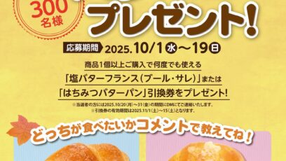 SNS応募の懸賞【Instagram懸賞】「塩バターフランス(ブール・サレ)」または「はちみつバターパン」引換券を300名様にプレゼント 締切:2025-10-19 VIE DE FRANCE‐プレゼントキャンペーン 賞品:商品1個以上ご購入で何度でも使える「塩バターフランス(ブール・サレ)」または、「はちみつバターパン」引換券(300名様...SNS応募の懸賞大量当選(100名~)の懸賞