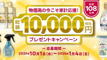 ネット応募の懸賞P&Gの製品10,000円相当を108名様にプレゼント 締切:2026-01-04 マイレピ‐家計応援!P&G製品プレゼントキャンペーン 賞品:P&Gの製品10,000円相当(108名様) 締切:2026年1月4日(日) ご応募には会員登録/ログイン...ネット応募の懸賞大量当選(100名~)の懸賞