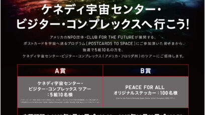 ネット応募の懸賞ケネディ宇宙センター・ビジター・コンプレックス ツアー、PEACE FOR ALL オリジナルステッカーを合計110名様にプレゼント 締切:2025-10-31 「POSTCARDS TO SPACE-平和を願うポストカードを宇宙へ送って、ケネディ宇宙センター・ビジター・コンプレックスへ行こう!」キャンペーン 賞品: ケネディ宇宙セン...ネット応募の懸賞大量当選(100名~)の懸賞