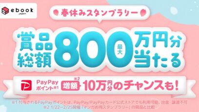 「春休みスタンプラリー」キャンペーン 賞品: ebookjapanで使える最大30%OFFクーポン 5,000本 PayPayポイント100円分 500本 PayPayポ...