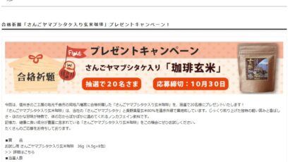 ネット応募の懸賞お試し用 さんごヤマブシタケ入り玄米珈琲 36gを20名様にプレゼント 締切:2025-10-30 信州きのこ工房‐合格祈願「さんごヤマブシタケ入り玄米珈琲」プレゼントキャンペーン 賞品:お試し用 さんごヤマブシタケ入り玄米珈琲 36g(20名様) 締切:2025年10月...ネット応募の懸賞