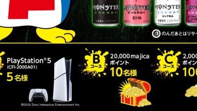 ネット応募の懸賞【アプリ】PlayStation®5、majicaポイント最大20,000ポイントを115名様にプレゼント 締切:2025-12-10 電子マネー majica‐日本で一番売れているエナジードリンクは"モンスター"ってマジか!?キャンペーン 賞品: PlayStation®5 (CFI-2000A01):5名...ネット応募の懸賞大量当選(100名~)の懸賞豪華賞品が当たる懸賞