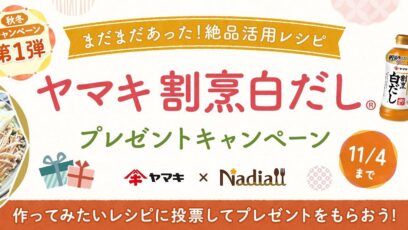 ネット応募の懸賞ヤマキ人気商品セットを15名様にプレゼント 締切:2025-11-04 Nadia‐絶品活用レシピ「ヤマキ 割烹白だし®」プレゼントキャンペーン 賞品:ヤマキ人気商品セット(15名様) 締切:2025年11月4日(火)15:00 レシピに...ネット応募の懸賞