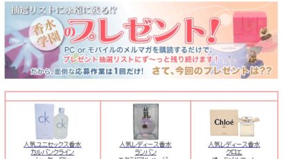 ネット応募の懸賞カルバンクライン シーケーワン EDT SP 100ml、クロエ オードパルファム EDP SP 50mlなどを合計9名様にプレゼント 締切:2025-11-03 香水学園‐プレゼントキャンペーン 賞品: カルバンクライン シーケーワン EDT SP 100ml(3名様) ランバン エクラドゥアルページュ EDP SP 100ml(3...ネット応募の懸賞