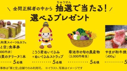 ネット応募の懸賞菊池市の旬の農産物、ころう君ぬいぐるみ、やまが和牛焼肉用、山鹿和栗スイーツ&カフェ「栗と空」お食事券などを合計20名様にプレゼント 締切:2025-11-03 山鹿市‐鞠智城デジタルクイズラリー 賞品: ころう君ぬいぐるみ+ぬいぐるみストラップ(5名様) 山鹿和栗スイーツ&カフェ「栗と空」食事券(2,000円分)+和栗のテリーヌ1...ネット応募の懸賞