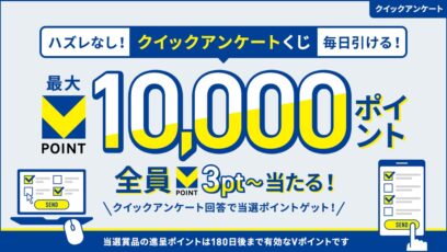 クイックアンケートくじ 賞品: 1等:Vポイント10,000ポイント(進呈条件あり) 2等:Vポイント100ポイント(進呈条件あり) 3等:Vポイント3ポイント(進呈条件...