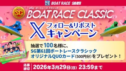 ボートレース蒲郡‐フォロー&リポストキャンペーン 賞品:オリジナルQUOカード500円分(100名様) 締切:2026年3月29日(日) 公式X(Twitter)アカ...