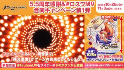 東方LostWord‐5.5周年感謝& #ロスワMV 合同キャンペーン 賞品: 伊吹萃香 特大アクスタ 10名様 9種セットアクスタ 5名様 締切:2025年11月3日...