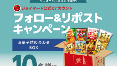 SNS応募の懸賞【X懸賞】お菓子詰め合わせBOXを10名様にプレゼント 締切:2025-10-26 ジョイマート‐フォロー&リポストキャンペーン 賞品:お菓子詰め合わせBOX(10名様) 締切:2025年10月26日(日) 公式X(Twitter)アカウントをフォロ...SNS応募の懸賞