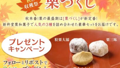SNS応募の懸賞【X懸賞】栗づくし3種を3名様にプレゼント 締切:2025-10-26 新杵堂‐フォロー&リポストキャンペーン 賞品:栗づくし3種(3名様) 締切:2025年10月26日(日) 公式X(Twitter)アカウントをフォロー&キャンペーン対...SNS応募の懸賞