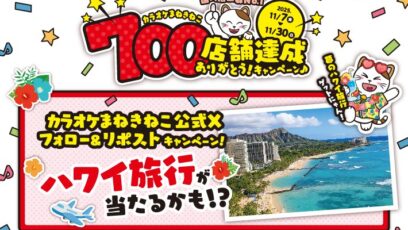 カラオケまねきねこ‐国内カラオケNo.1店舗数 #700店 突破記念 賞品: ハワイ旅行ペアチケット(2組4名様) お会計半額チケット(600名様) 1ヶ月室料無料チケ...