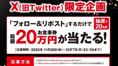 無添くら寿司‐フォロー&リポストキャンペーン 賞品:お食事券10,000円分(20名様) 締切:2025年12月7日(日) 公式X(Twitter)アカウントをフォロ...