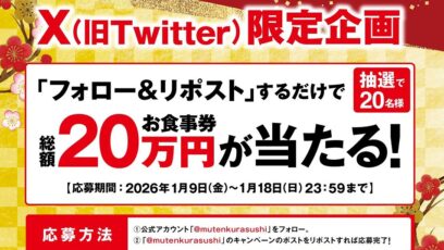 無添くら寿司‐フォロー&リポストキャンペーン 賞品:お食事券10,000円分(20名様) 締切:2026年1月18日(日) 公式X(Twitter)アカウントをフォロ...