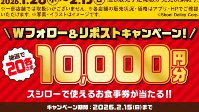 スシロー‐プレゼントキャンペーン 賞品:スシローで使えるお食事券10,000円分(20名様) 締切:2026年2月15日(日) ①@akindosushirocoと@...