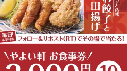 SNS応募の懸賞【毎日・X懸賞】やよい軒お食事券3,000円分が10名様にその場で当たる! 締切:2025-10-31 やよい軒‐鶏皮餃子と鶏竜田揚げの定食発売記念キャンペーン 賞品:やよい軒 お食事券3,000円分(10名様) 締切:2025年10月31日(金) やよい軒公式X(Tw...SNS応募の懸賞ギフト券・商品券が当たる懸賞毎日応募できる懸賞