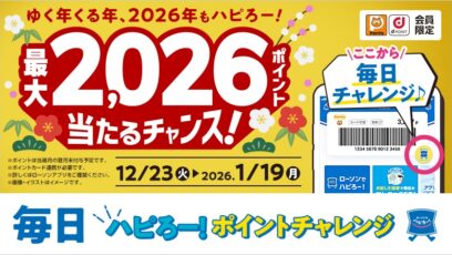 ローソン‐ハピろー!ポイントチャレンジ 賞品:最大2,026ポイント 締切:2026年1月19日(月) ローソンアプリのホーム画面からチャレンジ! ※詳細はキャ...
