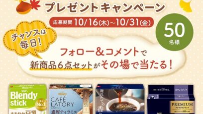 SNS応募の懸賞【毎日・Instagram懸賞】AGF®秋冬新商品セットが50名様にその場で当たる! 締切:2025-10-31 味の素AGF‐秋冬新商品発売記念 賞品:AGF®秋冬新商品セット(50名様) 締切:2025年10月31日(金) 応募方法 ①アカウントをフォロー ②投稿に飲みた...SNS応募の懸賞毎日応募できる懸賞