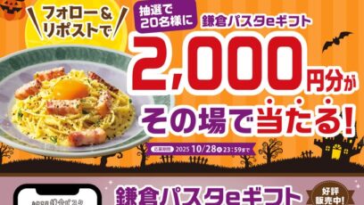 SNS応募の懸賞【毎日・X懸賞】鎌倉パスタeギフト2,000円分が20名様にその場で当たる! 締切:2025-10-28 鎌倉パスタ‐ハロウィンキャンペーン 賞品:eギフト2000円分(20名様) 締切:2025年10月28日(火) 鎌倉パスタ公式X(Twitter)アカウントをフォロー...SNS応募の懸賞ギフト券・商品券が当たる懸賞毎日応募できる懸賞
