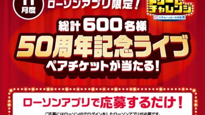 ローソンアプリ限定 アプリでドリームチャレンジ 賞品:50周年記念ライブ ペアチケット(600名様) 締切:2025年11月30日(日) アプリ内からご応募ください。...